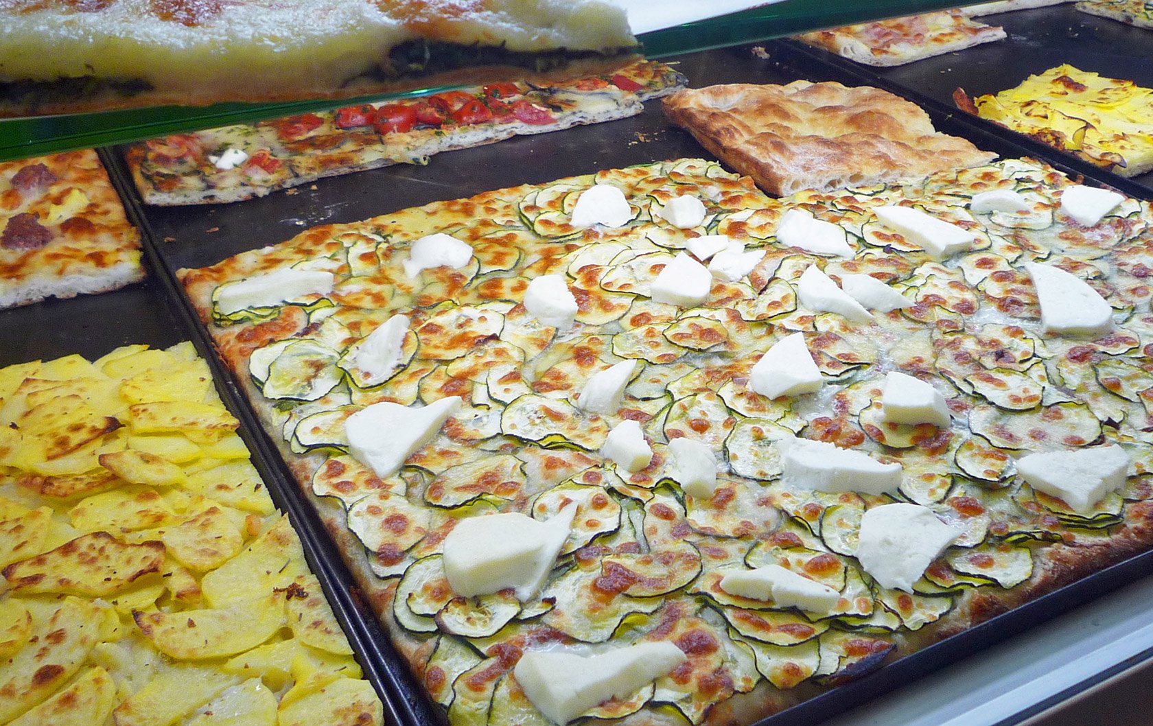 For the days when nothing sounds as satisfying as pizza, but sitting down to eat one will throw off the schedule for the day, there is another option: pizza al taglio. The name means “pizza by the slice” and that is exactly what one gets when they order. Faster than sitting down for a pizza to bake, the al taglio option offers a slightly different flavor – these pizzas are often baked in electric ovens rather than wood – with all the toppings and fixings of the round pizzas one would expect in Italy.