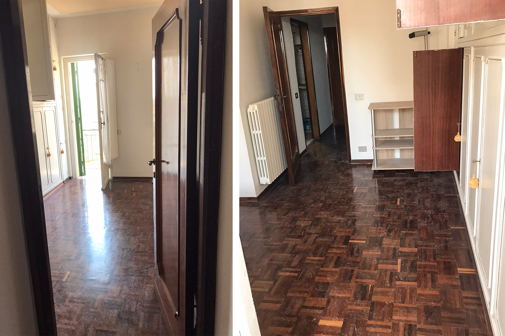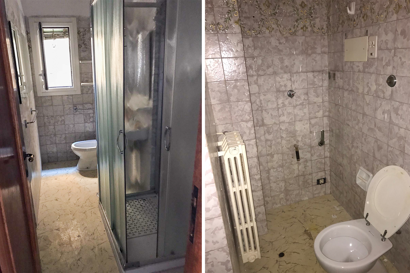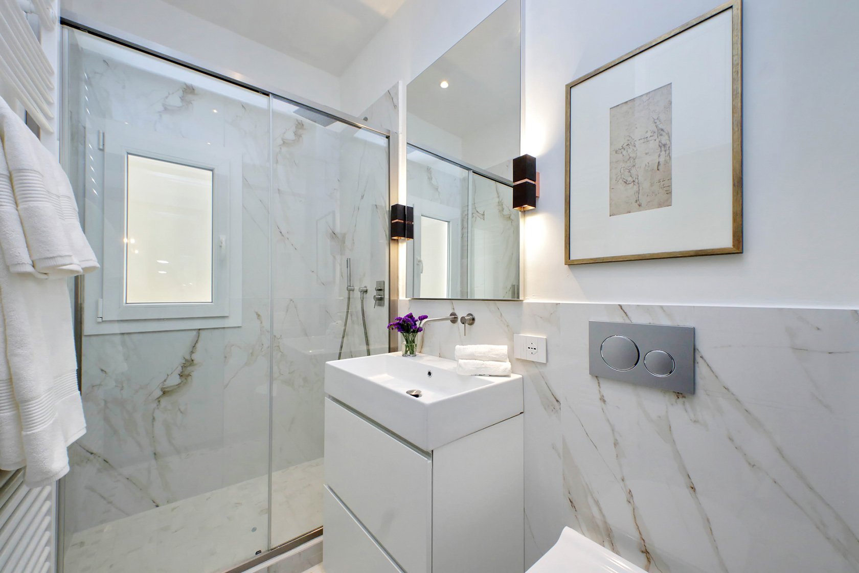 The white marble tiles, modern lights and white sink completely transformed the space. The large glass shower door panels and opaque glass on the window ensures privacy while still flooding the room with natural light. There’s also space in the newly redesigned second bathroom for a combo washer and dryer. Even though dryers aren’t very common in Italy, we enjoy the convenience and comfort of having the combo unit. It’s these little details we know our owners love.