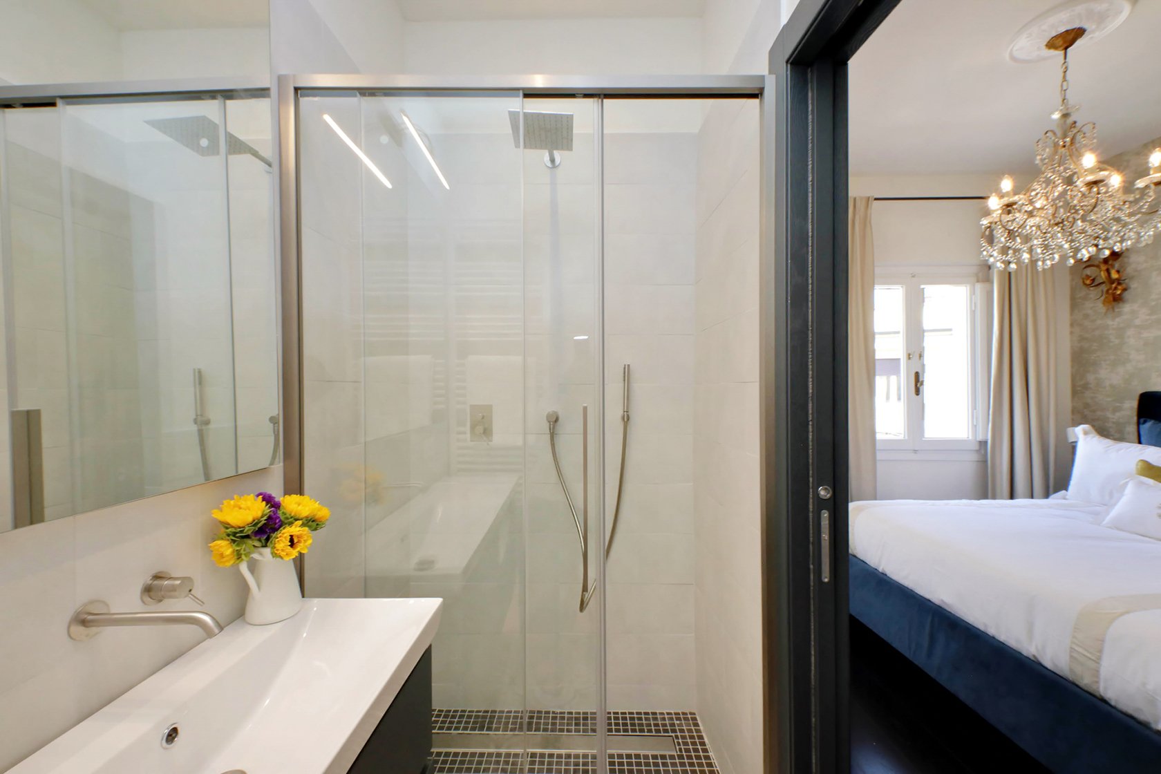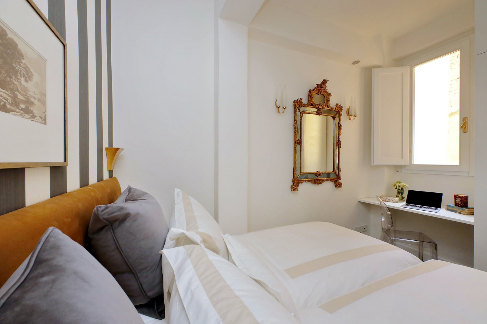 The design is magic here, with the room full of softness and light. You’ll spot the Maestro’s signature Hermès scarf, which is a design tradition in our Paris Perfect fractional apartments that we are pleased to continue in our first Italy Perfect Shared apartment. The blues and gold in the scarf’s design blends with the wallpaper, antique sconces and chandelier, and royal blue of the headboard. On the bed you’ll find specially made Egyptian cotton sheets with a custom design – a fleur-de-lis for Florence of course!