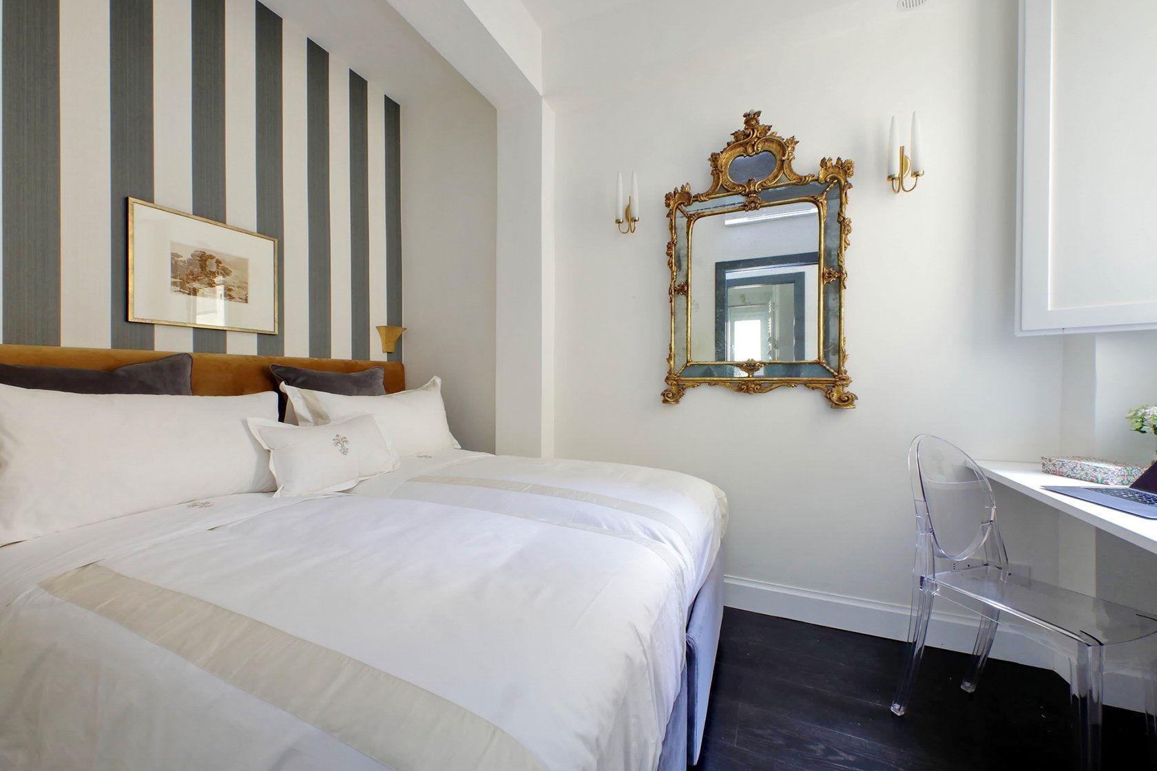 The room’s decor is perfectly balanced with taupe and gold hues tied together with the statement striped wallpaper. The antique mirror is wonderfully ornate and catches the warm afternoon light from the window above the work space. You’ll love sinking into the same luxury linens custom made in Italy for Italy Perfect Shared.