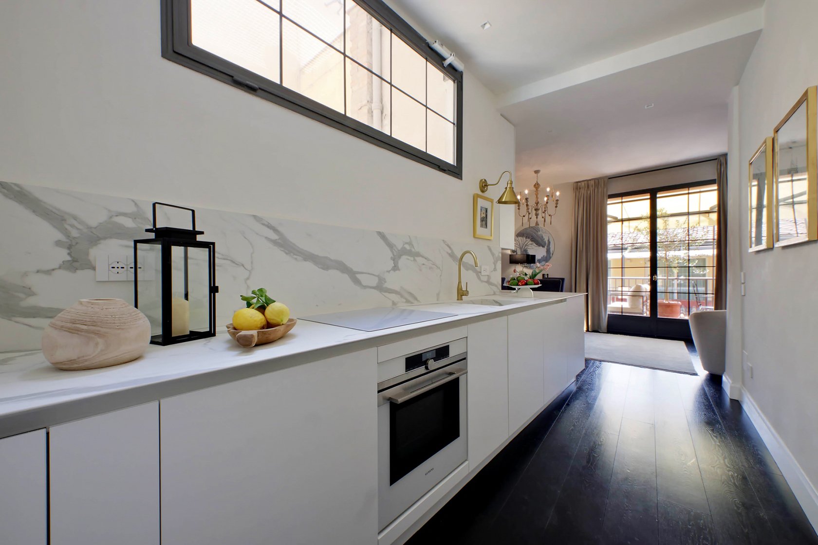 With a beautifully designed living area and terrace, one important requirement of the remodel was complete. But there was still a major issue to resolve. Every apartment—even the most beautiful you’ll see— has challenges and opportunities when you remodel it. The Maestro originally had a very large entryway with a kitchen tucked away behind it in a separate room. Puzzling over possible floor plans, we realized that there was a great option we hadn’t initially considered. By utilizing the spacious entryway, we could create an open-plan kitchen and simultaneously create a more convenient design plus create space for a second bedroom where the kitchen had previously been located. Opportunity!