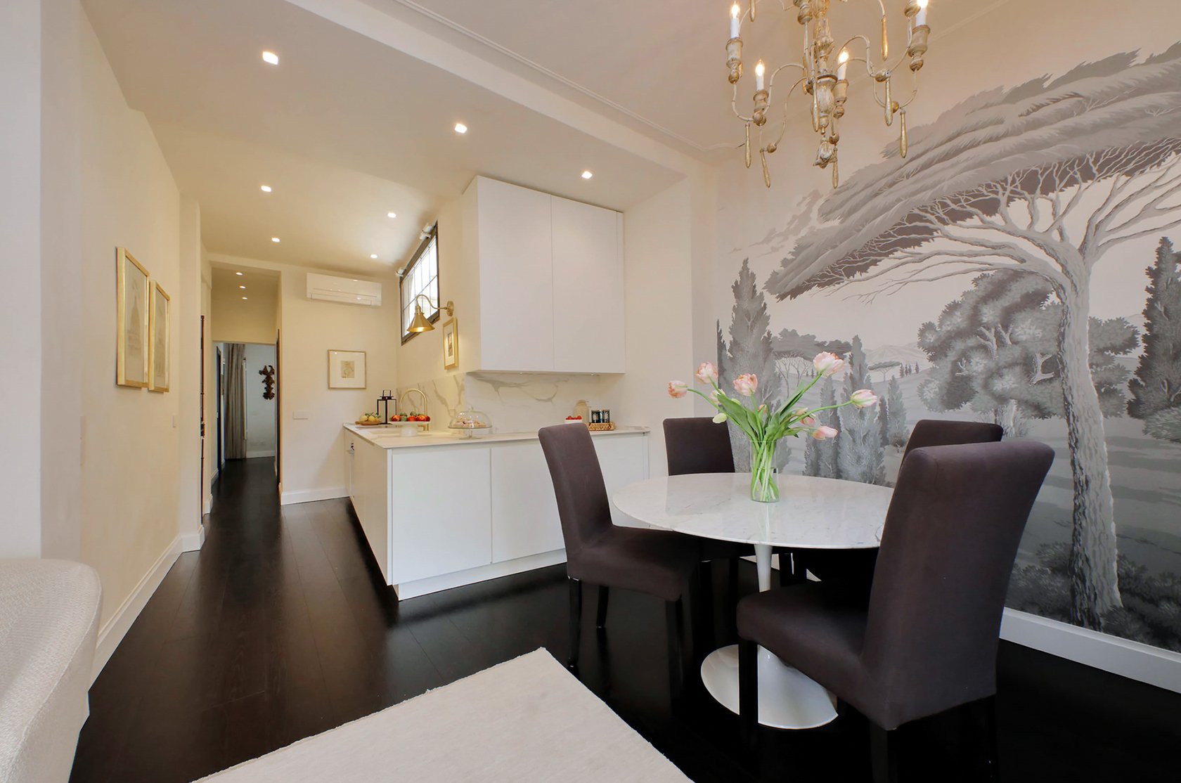 We particularly love the dining area at Maestro, which has one of the key design features of the apartment. The gorgeous wallpaper is from a long-established European design company and the classic umbrella pine is just so very Italian. In fact, you can even spot one from the apartment’s back terrace in the master bedroom! Here the contemporary design of the stunning marble table and the round mirror blends so beautifully with an antique Italian dresser found at the antique fair in Parma. Can you spot how the wallpaper design is reflected in the mirror?