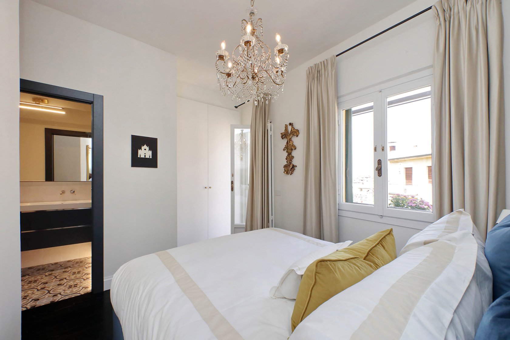 The master bedroom has its own private balcony looking out over the Oltrarno neighborhood with a lovely view of the tower of Palazzo Vecchio. You’re right in the historic heart of Florence! Yet, in the distance you’ll see the hills of Tuscany, a beautiful reminder of how ideally situated Florence is for exploring one of Italy’s most beautiful regions.