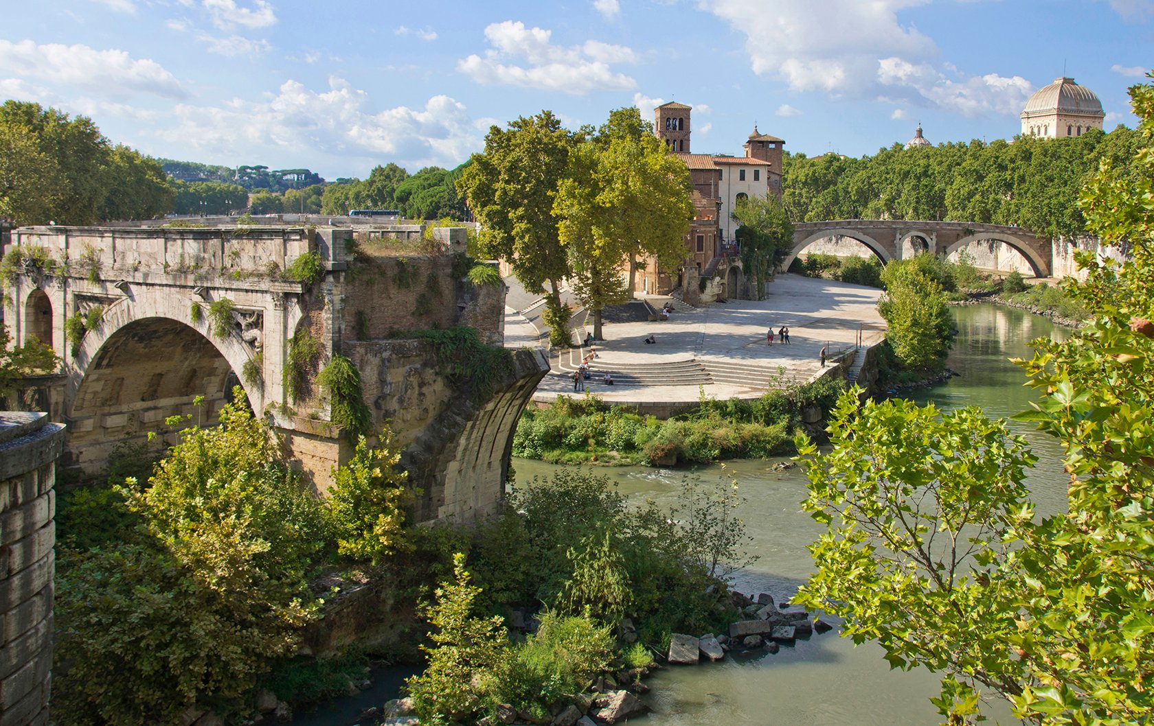While on the Isola Tiberina, walk south to the scenic spot at the tip where you can see one remaining arch of another bridge. This is the last piece of Rome’s oldest bridge, called the Ponte Rotto (Broken Bridge) or the Ponte Emilio, which originally spanned the entire Tiber. Built in the 2nd century BC, the bridge must have been a glorious sight in its day. Over the centuries, it was damaged many times by floods and was eventually partially demolished to make room for the Ponte Palatino, a 19th-century bridge nearby. One of the treasures of Rome is how these pieces of the ancient city are a part of the city’s landscape today. While in the area, read more about where to find a traditional Roman meal on the Isola Tiberina.